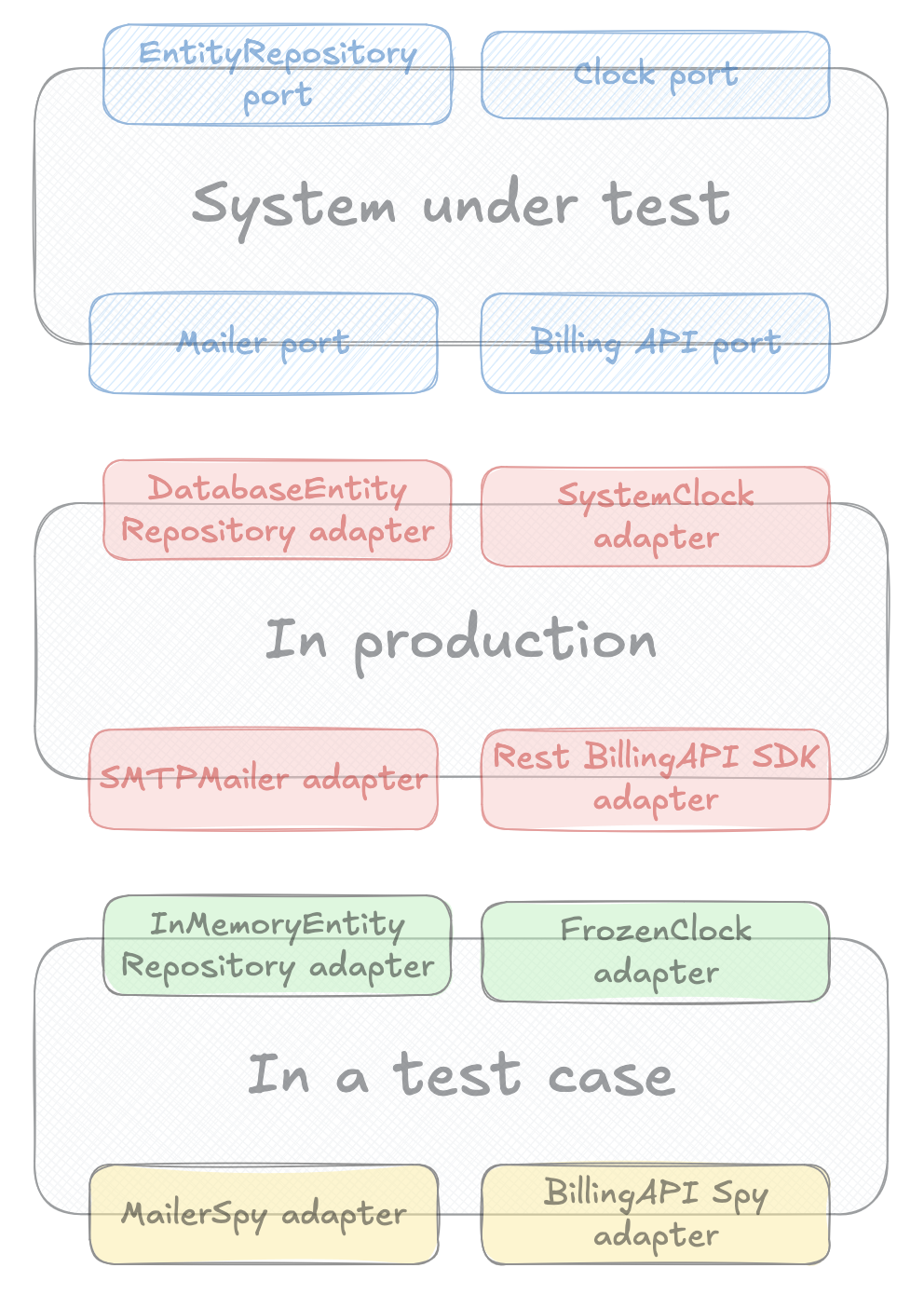 In more broad terms, the idea of ports and adapters from hexagonal architecture can be used. Ports are holes in our SUT that we want to fill in with different shaped pegs (adapters). These adapters are either real-world implementations (DatabaseEntityRepository, SystemClock) or test doubles (InMemoryEntityRepository, FrozenClock). Ports live on the edge of our black-box, and allows us to connect it with our pre-defined environment.
