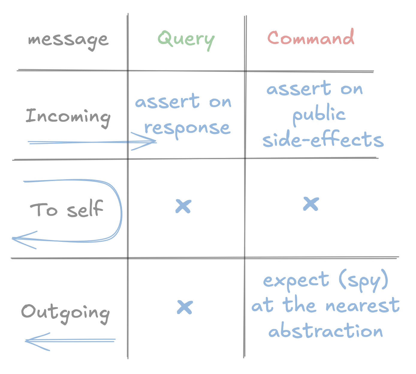 Here is a matrix on how we’d like to make assertions for each kind of message and output (credits for the idea: Sandi Metz):
