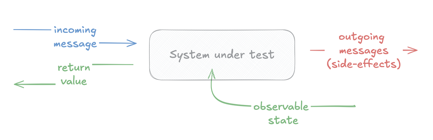 We can also see from this diagram, that every test scenario starts with an incoming message. For low-level (unit) tests that will probably be a method call, while for higher level tests that would be simulating a HTTP request or dispatching a command on the command bus.